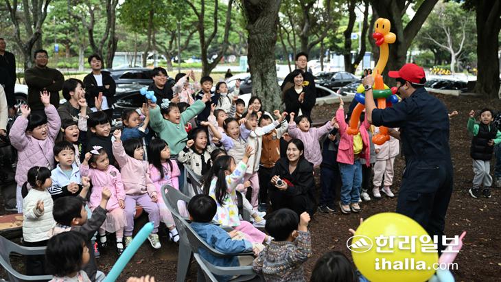 9일 제주특별자치도 종합민원실 맞은편 공원에서 열린 청렴 라이브 콘서트 공연에 참가한 어린이집 원아들이 재미있는 시간을 보내고 있다. 강희만기자