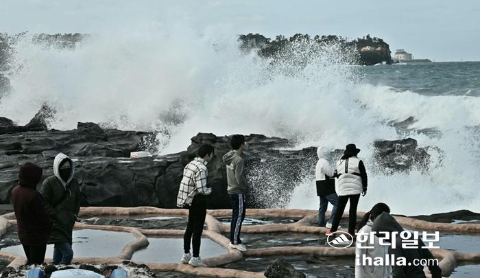 [한라일보] 10일 제주 육상과 해상에 바람이 강하게 불면서 해상에 풍랑특보가 발효중인 가운데 제주시 애월읍 구엄리 해안에 높은 파도가 일고 있다. 강희만 기자 photo@ihalla.com