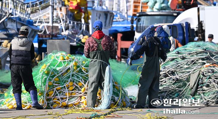 11일 제주시 한림항에서 선원들이 조업에 나서기 앞서 그물을 손질하고 있다. 강희만기자