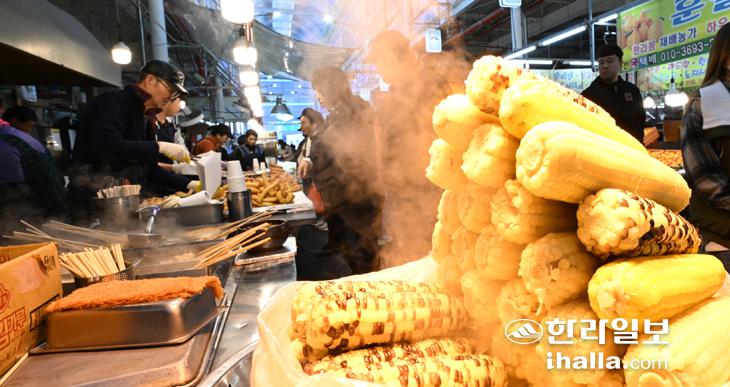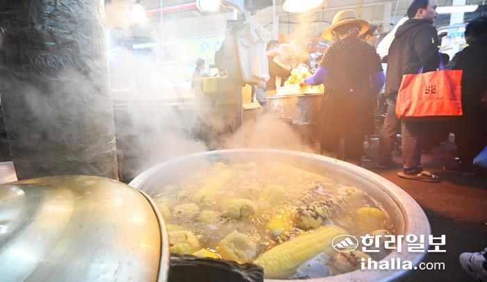 [한라일보] 12일 제주시민속오일시장 먹거리 좌판에서 찰옥수수가 모락모락 익어가고 있다. 이날 한라산에서는 지난해보다 18일 빨리 눈이 관측되기도 했다. 이상국기자