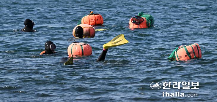 11일 서귀포시 대정읍 일과리 해안에서 해녀들이 차가운 바다에 들어가 물질작업을 하고 있다. 강희만기자