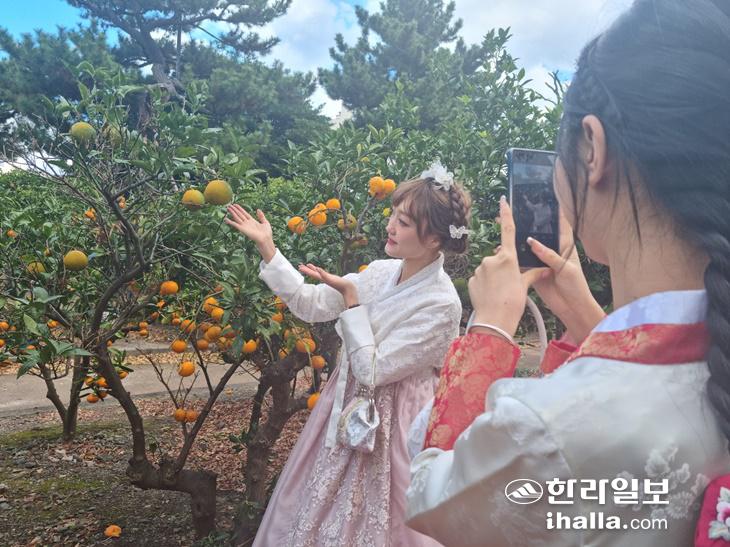 13일 제주시 원도심에 위치한 제주목관아에서 한복을 곱게 차려입은 중국인 관광객들이 감귤 배경으로 서로 사진을 찍고 있다.