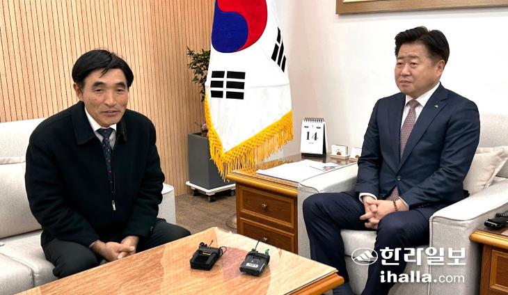오영훈 제주특별자치도지사가 14일 도지사 집무실에서 오임종(왼쪽) 4·3평화재단 이사장 직무대행과 면담을 진행하고 있다.