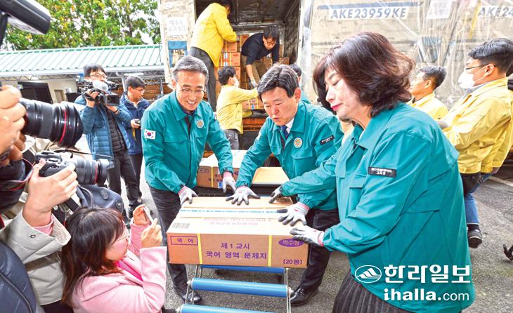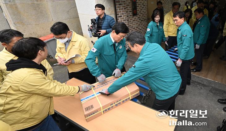 [한라일보] 2024학년도 대학수학능력시험을 이틀 앞둔 14일 제주도교육청에 수능 문답지가 도착하자 직원들이 옮기고 있다. 제주에서는 16일 16개 시험장에서 수능이 치러진다. 강희만기자