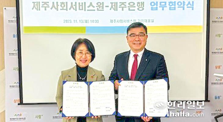 제주특별자치도사회서비스원(원장 양시연)과 제주은행(은행장 박우혁)은 지난 13일 '사회공헌 문화 확산 및 지역사회 서비스 발전'을 위한 협약을 체결했다.