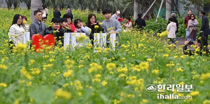 14일 서귀포시 남원읍 휴애리자연생활공원을 찾은 관광객들이 유채꽃밭에서 기념사진을 찍고 있다. 이상국기자