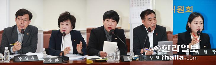 왼쪽부터 강상수 의원, 박두화 의원, 홍인숙 의원, 양영식 의원, 이승아 의원. 제주도의회 제공