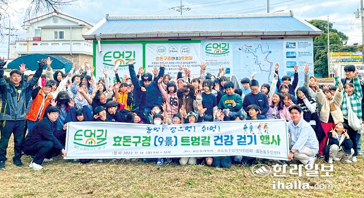 서귀포시 효돈동(동장 강윤영)은 지난 14일 '효돈구경(9景) 트멍길' 조성 완료에 따라 지역주민과 관내 학생 100여 명을 초청해 효돈동주민자치위원회(위원장 강승환)와 효돈동체육회(회장 김문원)의 지원으로 정식 개장 행사인 '놀멍 걸으멍 쉬멍! 효돈구경 트멍길 건강 걷기 행사'를 개최했다.