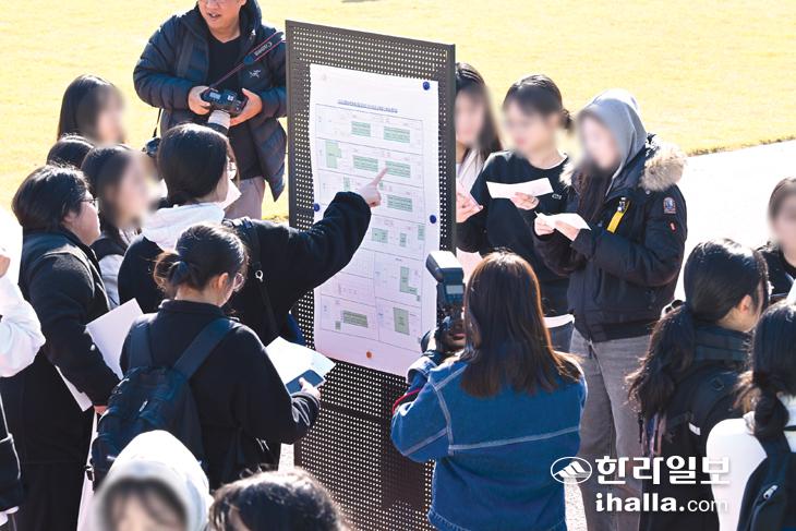 '2024 대학수학능력시험'을 하루 앞둔 15일 제주중앙여자고등학교 시험장에 예비소집된 수험생들이 시험 자리를 확인하고 있다. 이상국기자