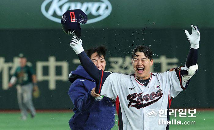 16일 일본 도쿄돔에서 열린 아시안프로야구챔피언십(APBC) 예선 1차전 대한민국과 호주의 경기. 10회말 무사 1,2루에서 노시환이 끝내기 안타를 친 뒤 환호하고 있다. 연합뉴스
