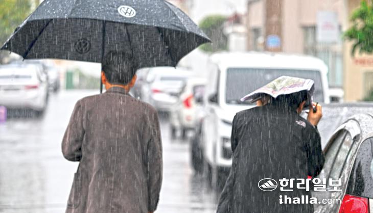 겨울을 재촉하는 많은 비가 내린 16일 제주시내 한 거리에서 행인 두명이 대조되는 모습으로 걷고 있다. 강희만기자