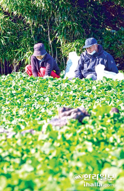 대체로 맑고 포근한 날씨를 보인 20일 제주시 조천읍 한 밭에서 농민들이 유채나물을 수확하고 있다. 이상국기자