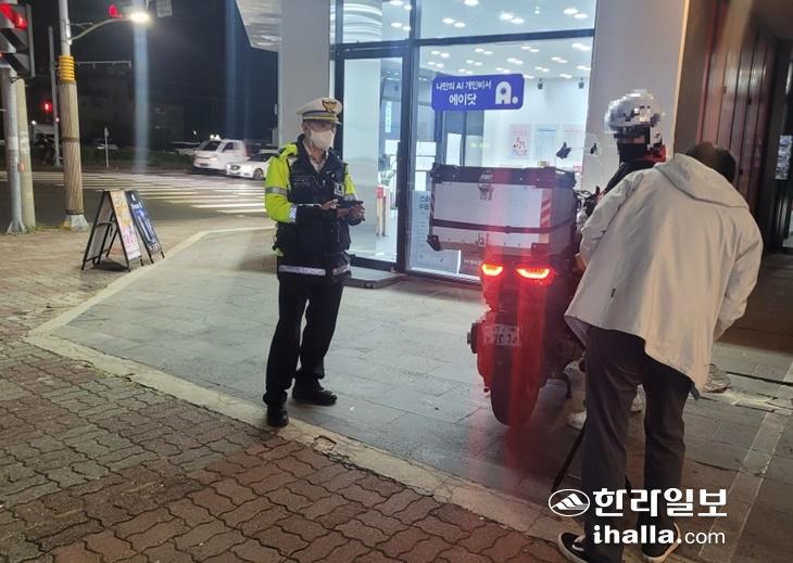 21일 서귀포시 동홍동 일원에서 서귀포시와 유관 기관 합동으로 불법 이륜차 단속이 이뤄지고 있다. 서귀포시 제공