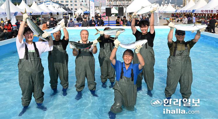 제23회 최남단방어축제가 열린 23일 서귀포시 모슬포항을 찾은 관광객들이 방어잡기 체험을 하고 있다. 이상국기자