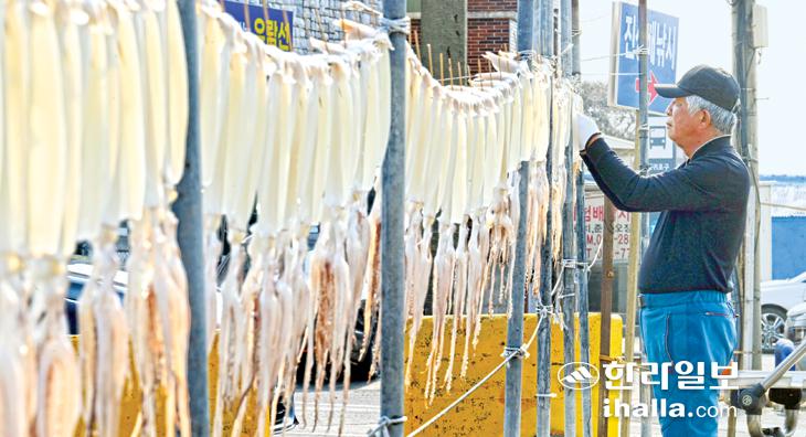 23일 제주시 한경면 자구내포구에서 한 상인이 오징어말리기 작업을 하고 있다. 이상국기자