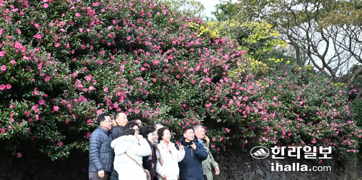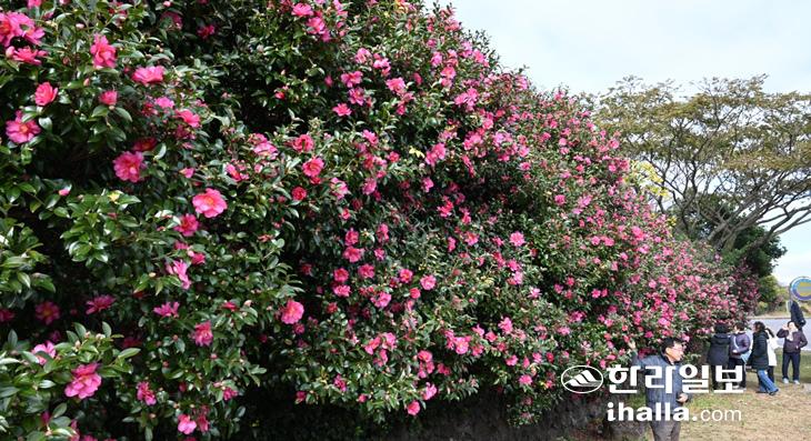 [한라일보] 25일 서귀포시 안덕면 도로변에 동백꽃이 아름답게 피어 일대를 오가는 이들의 눈길을 사로잡고 있다. 이상국기자