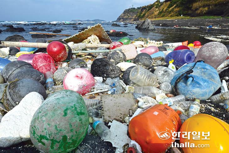 27일 제주시 한경면 수월봉 인근 해안에 수많은 쓰레기가 밀려와 청정제주 미관을 해치고 있다. 강희만기자