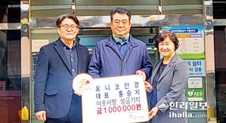 유니코안경 홍승지 대표는 지난 27일 제주시 이도2동주민센터(동장 한재영)를 방문해 이웃사랑 성금 100만원을 제주사회복지공동모금회(회장 강지언)에 기탁했다.
