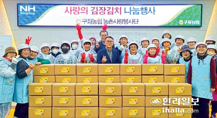 구좌농협 농촌사랑 봉사단(단장 박순자)은 지난 28일 제주시 구좌농협 유통센터 구내식당에서 회원 20여 명과 함께 따뜻한 겨울나기를 위한 '사랑의 김장김치 나눔 행사'를 가졌다. 봉사단 회원들은 이날 직접 만든김치를 지역 내 취약계층 및 고령농업인 100여 가구와 사회복지시설에 전달·위로했다.