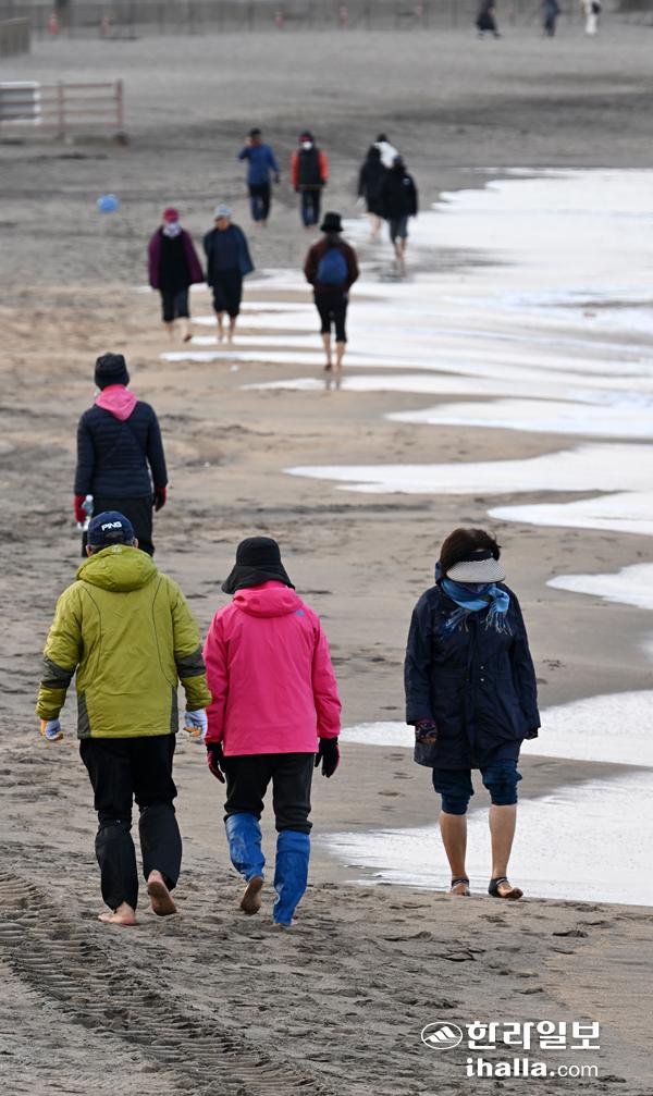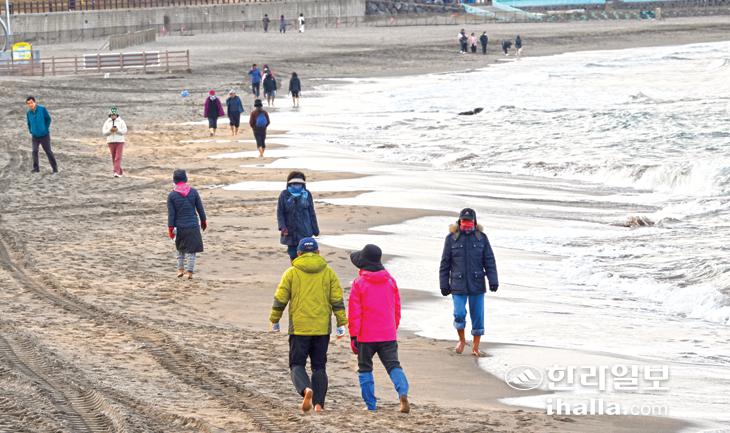 [한라일보] 29일 제주시 이호해수욕장에 많은 사람들이 찾아 맨발로 백사장 걷기운동을 하고 있다. 강희만기자