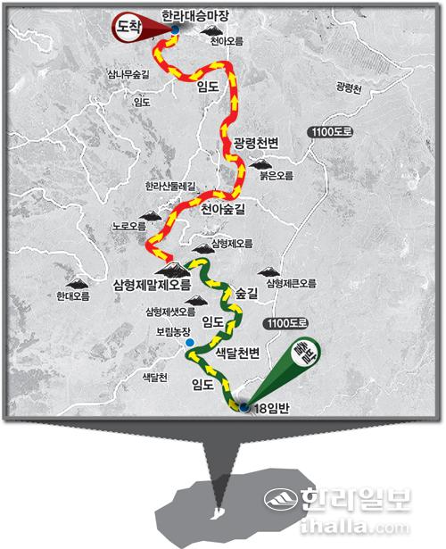 18임반 입구에서 내린 참가자들은 준비운동으로 함께 몸을 풀고, 안전에 대한 주의 사항을 전해 들은 뒤 본격적인 투어를 시작한다. 보림농장으로 향하는 길은 떨어진 나뭇잎으로 가득하다. 숲의 단풍나무는 빨간 잎을 모두 떨구고 있다. 대신 노란 잎을 단 나무들이 마지막 힘을 쓰고 있다. 보림농장에 못 미쳐 방향을 틀어 삼형제오름을 향해 숲속으로 들어선다. 숲속 하천의 이끼 낀 바위를 덮고 있는 화려한 단풍잎 무더기는 참가자들의 발을 잡고 놓지 않는다. 고요한 물웅덩이에는 하늘도 내려와 있다. 조릿대 무성한 옛 임도를 따라 한참을 가면 잎을 떨군 나무들 사이로 삼형제말젯오름이 보인다. 가쁜 숨을 달래며 오른 오름 정상은 오묘한 빛깔을 지닌 참빗살나무 열매가 지천이고, 울긋불긋 오름 너머 구름이 넘나드는 한라산 정상이 눈앞으로 다가온다.