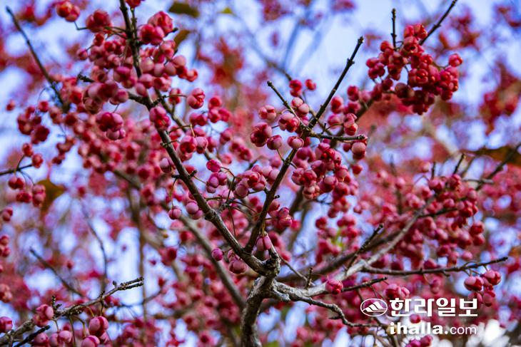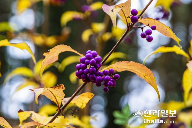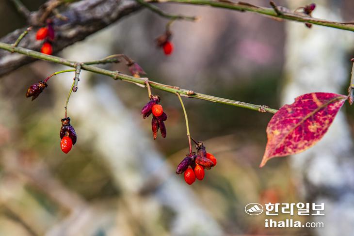 마른 하천엔 갖가지 단풍잎 한가득오묘한 빛깔 참빗살나무 열매 눈길광령천변 걷는 조릿대 숲길도 일품