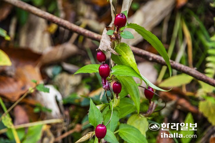광령천을 옆에 두고 천연림 숲길을 따라 조릿대 사이를 한참을 내리면 다시 천아숲길과 만난다. 천아숲길은 바리메오름까지 이어지는 임도와 하나가 된다. 임도를 따라 바리메오름 쪽으로 조금 가다 다시 방향을 틀면 또 다른 임도로 내려선다. 임도는 한라대 승마장 입구에 이른다. 부지런히 걸음을 옮기는 시야에 앙증맞은 덩굴용담의 빨간 열매가 시선을 잡는다. <양영태 제주여행작가>