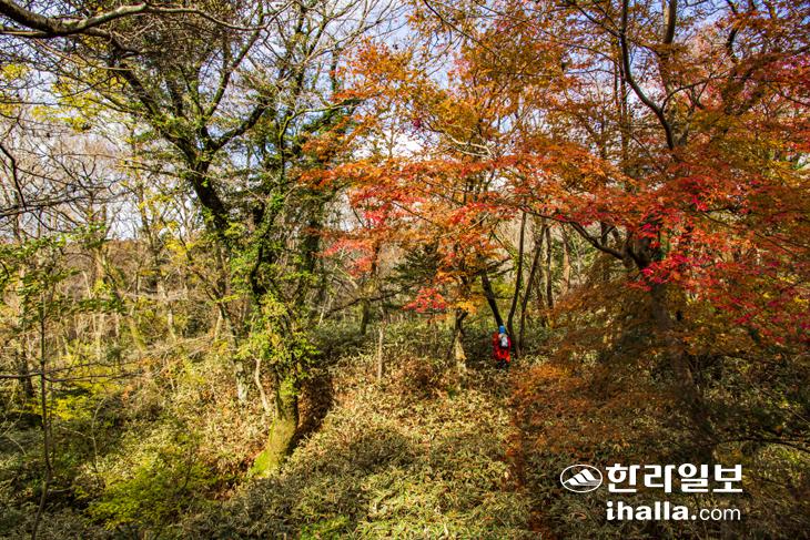지난달 4일 '2023 제주섬 글로벌 에코투어' 12차 행사에서는 울긋불긋 물들인 단풍을 감상하며 늦가을의 정취를 만끽할 수 있었다. 삼형제말젯오름 정상에서 내려오는 길. 양영태 작가