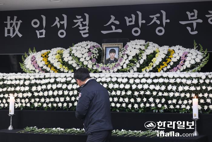 2일 제주시 연동 제주소방안전본부 1층 회의실에 마련된 고 임성철 소방장의 시민분향소. 임 소방장은 지난 1일 화재 진압 중 사고로 순직했다. 연합뉴스