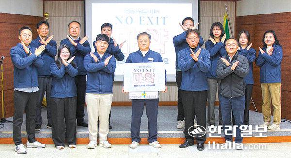 안전보건공단 제주지역본부(본부장 심우섭)는 지난 4일 공단 사무실에서 심우섭 제주지역본부장 및 직원 포함 15여명이 참석한 가운데 '노 엑시트(NO EXIT)' 캠페인에 동참했다.