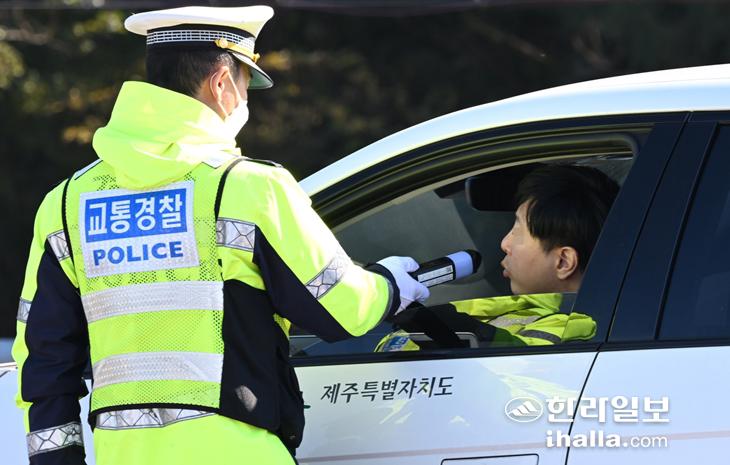 5일 제주시 애월읍 예원교차로에서 경찰들이 음주운전 단속을 하고 있다. 이상국기자
