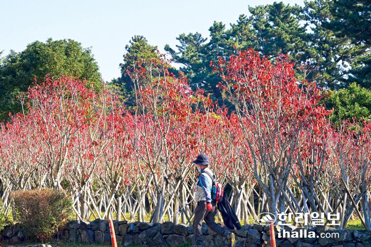5일 제주시 애월읍 항파두리항몽유적지에 참빗살나무가 붉게 물들어 눈길을 끌고 있다. 이상국기자