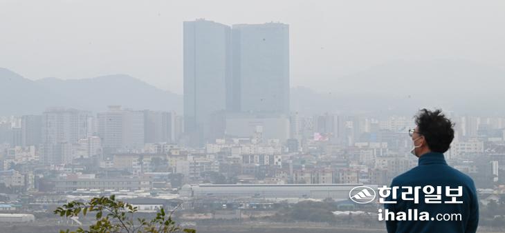 6일 제주시 도두봉에서 바라본 제주시내가 미세먼지로 인해 뿌옇게 보이고 있다. 이상국기자