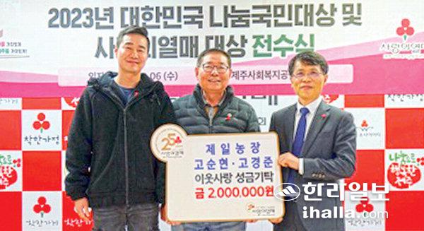 제일농장 고순현·고경준 대표는 지난 6일 제주사회복지공동모금회(회장 강지언)를 방문해 이웃사랑 성금 200만원을 기탁했다. 이번 성금은 고순현·고경준 부자가 지역사회 어려운 곳에 온정을 전하고자 마련했다.