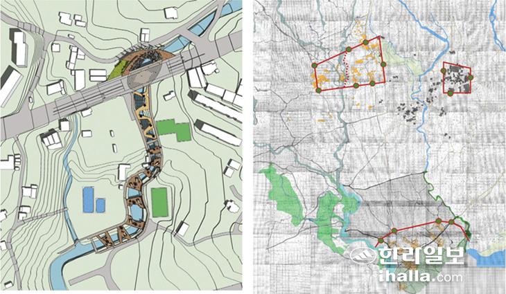 서귀포건축문화연구회의 '산지물 활성화 계획'(왼쪽)과 '서귀포 지적원도와 4·3성' 이미지. 서귀포시 제공