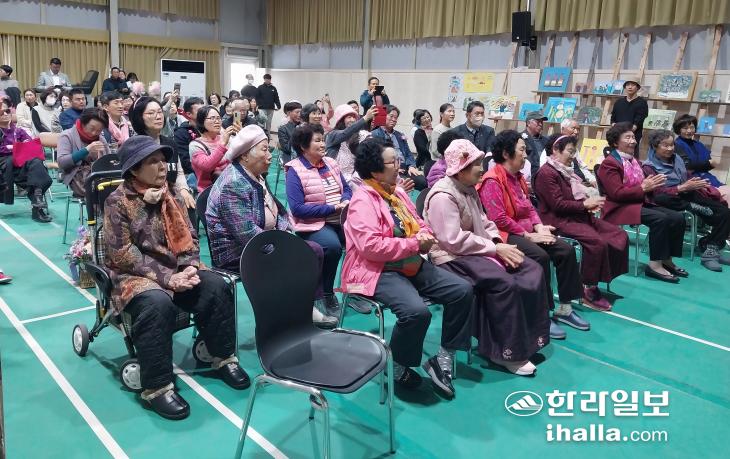 9일 전시 오프닝 행사가 열린 선흘체육관에 모인 그림 그리는 할머니들과 마을 주민들.