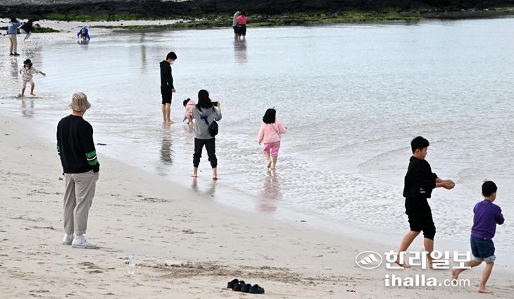 겨울인데도 20℃를 넘나드는 이상고온으로 제주전역이 포근한 날씨가 이어지고 있는 가운데 지난 9일 제주시 한림읍 협재해수욕장을 찾은 관광객들이 물놀이를 즐기고 있다. 강희만기자