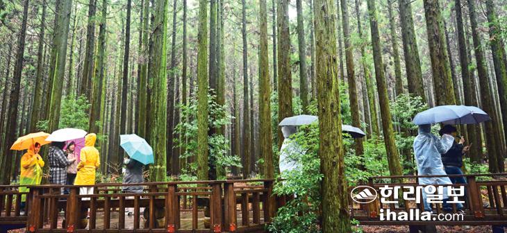 겨울비가 내린 11일 서귀포시 표선면 남조로 사려니숲길을 찾은 관광객들이 우산을 쓰고 삼나무숲을 걷고 있다. 이상국기자