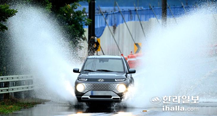 비가 내린 11일 서귀포시 성산읍 서성일로를 달리는 차량이 물보라를 일으키고 있다. 이상국기자