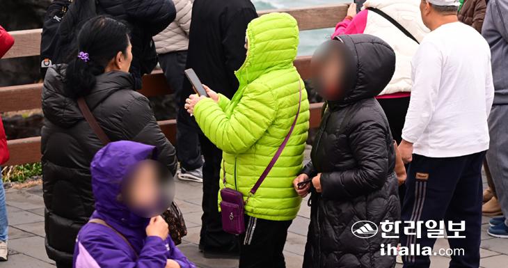 바람이 불고 겨울비가 내리면서 기온이 크게 떨어진 12일 제주시 용두암에 두꺼운 겨울옷을 입은 외국인 관광객들이 바다에서 불어오는 찬 바람에 옷깃을 여미고 있다. 이상국기자