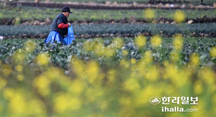 13일 제주시 한경면 고산리 한 농경지에서 농민들이 유채꽃을 배경으로 브로콜리 수확 작업을 하고 있다. 강희만기자