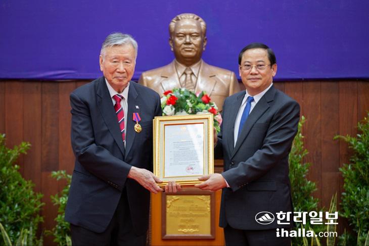 13일 라오스 정부로부터 명예 시민권을 받고 있는 부영그룹 이중근 회장.