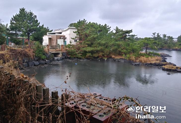14일 오전 성산포 철새 도래지. 바다와 맞닿은 우수 박스에서 흘러나오던 오수는 멈춘 상태였다. 진선희기자