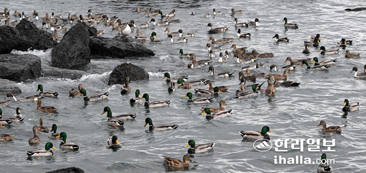 14일 제주시 구좌읍 평대리 해안가 양식장 배출구에 겨울철새인 오리들이 찾아 먹이 활동을 하고 있다. 강희만기자