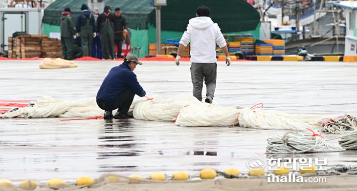 14일 제주시 한림항에서 어민들이 그물 정리 작업으로 분주한 시간을 보내고 있다. 이상국기자