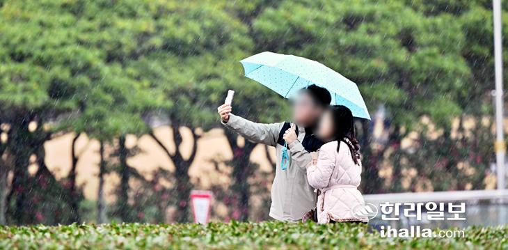 겨울비가 내린 14일 서귀포시 오설록 녹차밭을 찾은 관광객들이 제주의 추억을 남기고 있다. 이상국기자