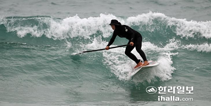 14일 제주시 구좌읍 월정리해수욕장에서 한 서퍼가 파도타기를 하며 겨울바다를 즐기고 있다. 강희만기자