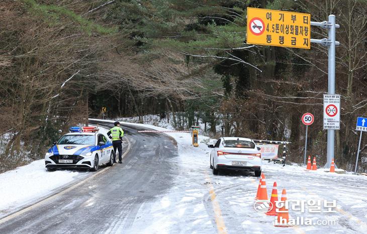제주도 산간에 대설특보가 내려진 17일 오전 제주시 어승생 삼거리 1100도로 입구에서 경찰이 차량을 통제하고 있다. 연합뉴스