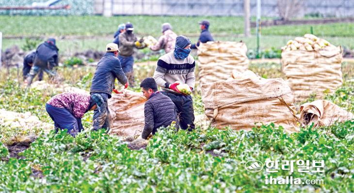 18일 제주시 한경면 고산리 농경지에서 농민들이 무 수확 작업을 하고 있다. 강희만기자