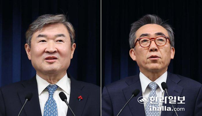 국가정보원장 후보자로 지명된 조태용 국가안보실장(왼쪽)과 외교부 장관 후보자로 지명된 조태열 전 외교부 2차관이 19일 서울 용산 대통령실 청사에서 열린 김대기 대통령 비서실장의 인선안 발표 브리핑에서 각각 소감을 말하고 있다. 연합뉴스
